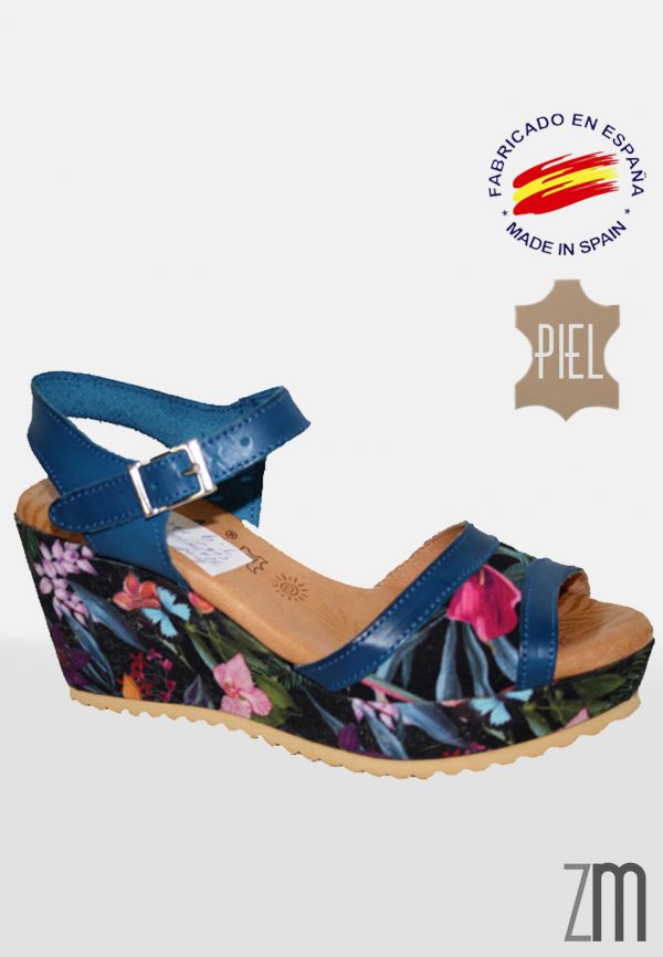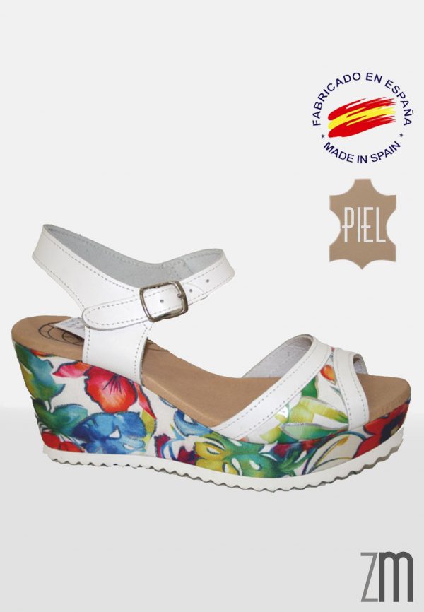 Sandalia fabricada en piel, forrada con detalles florales y planta de gel. Calzado nacional.