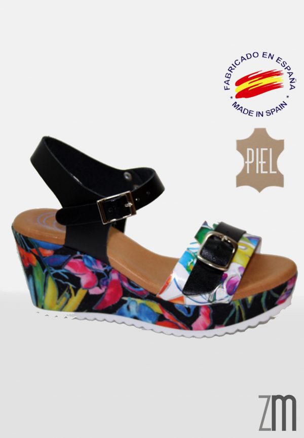 Cuña forrada detalle floral en piel de color negro combinado clorofila, planta de gel, hecho en España