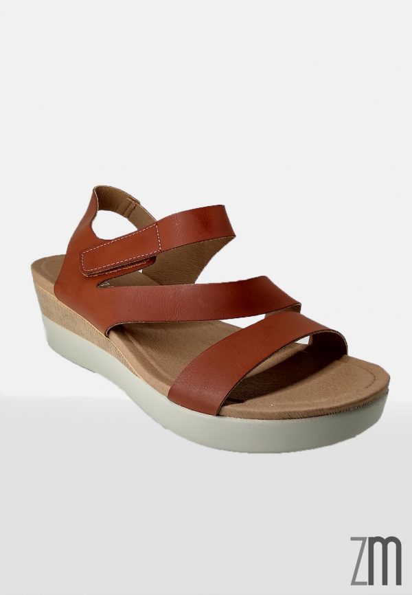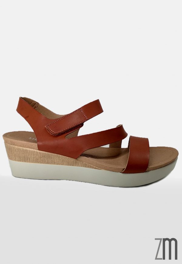 Sandalia con una cuña de 5,5 cm de poco peso y plantilla blanda y muy cómoda con sujeción de belcro. Calzado de importación.