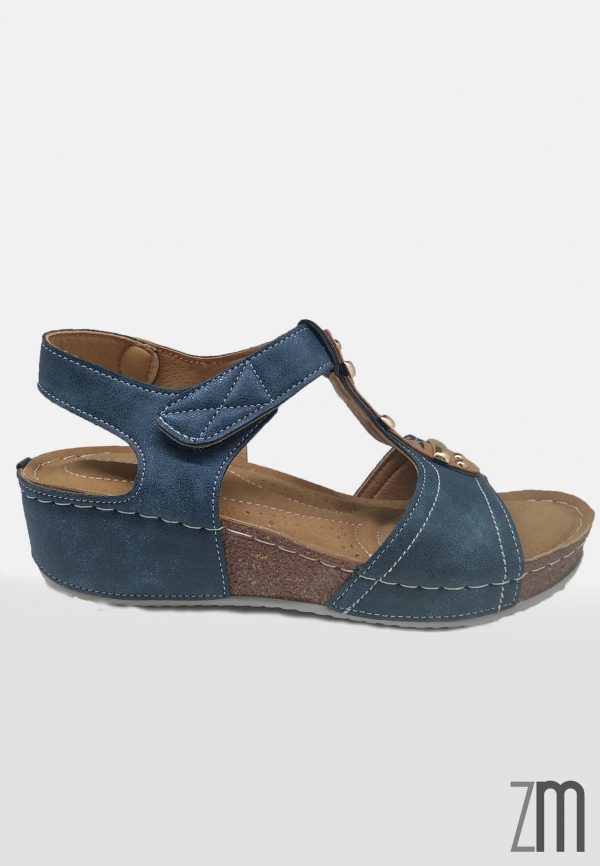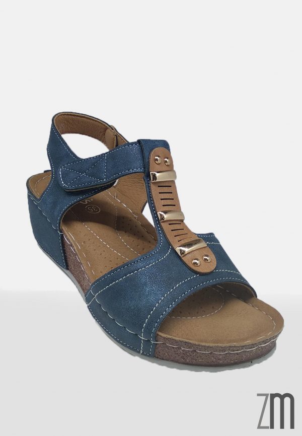Sandalia bioconfort de color azul brillante con plantilla acolchada muy cómoda,con sujeción de belcro con una cuña de 4 cm de goma antideslizante. Calzado de importación.