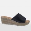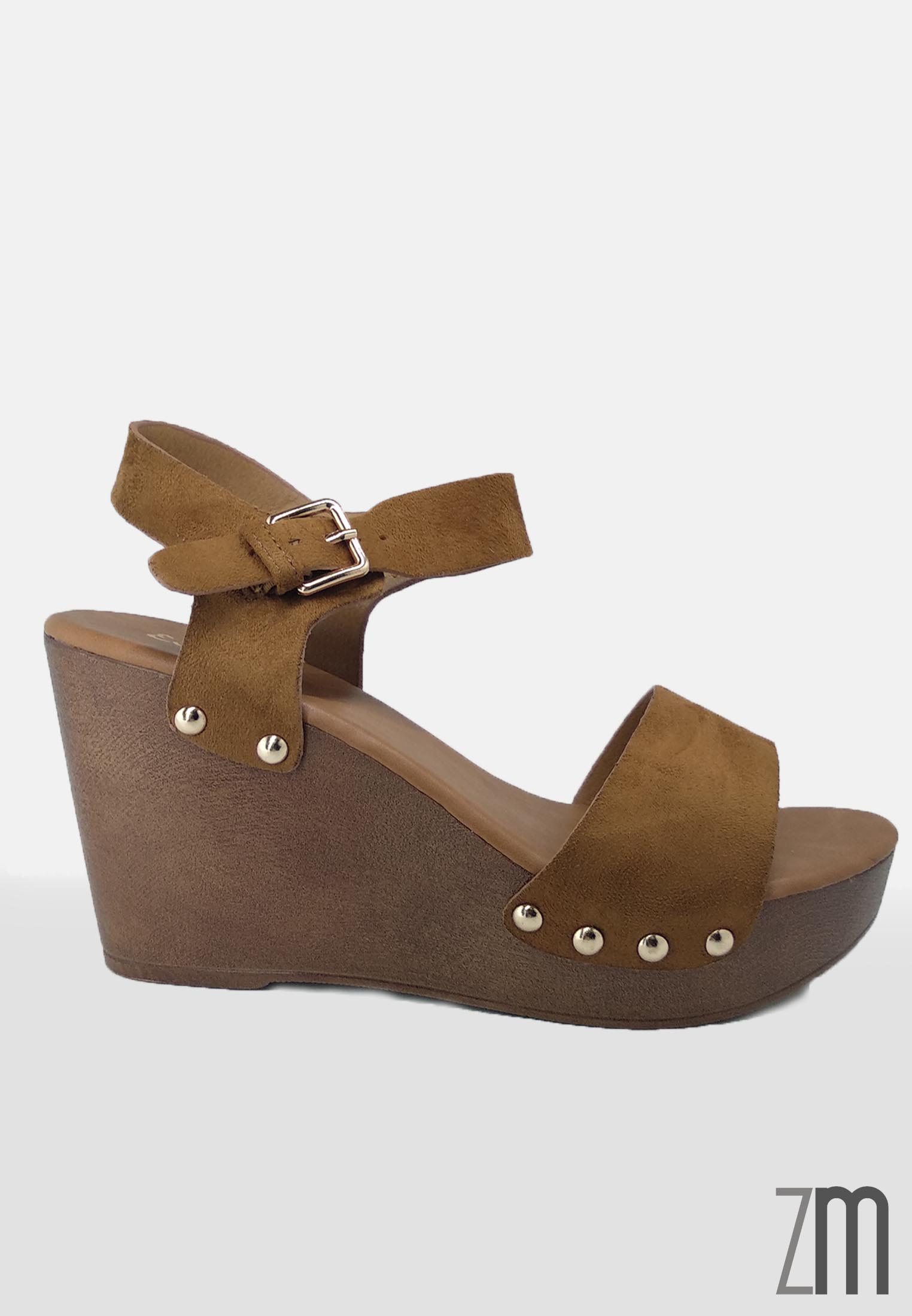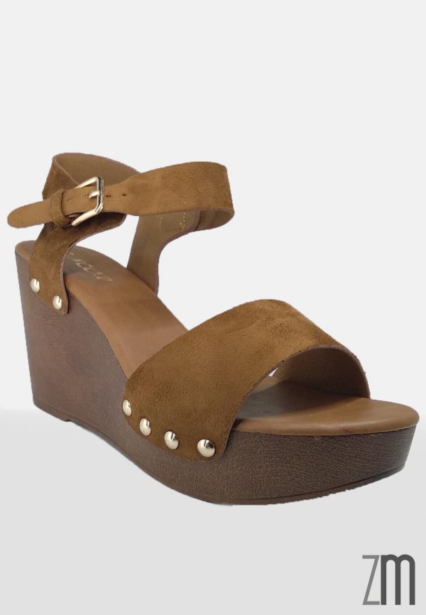 Sandalia con cuña de imitación de madera de peso ligero con una altura de 9 cm de cuña y 4 cm de plataforma fabricada en antelina clavada. Calzado de importación.