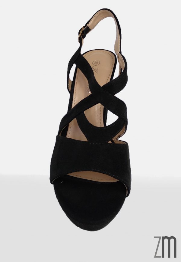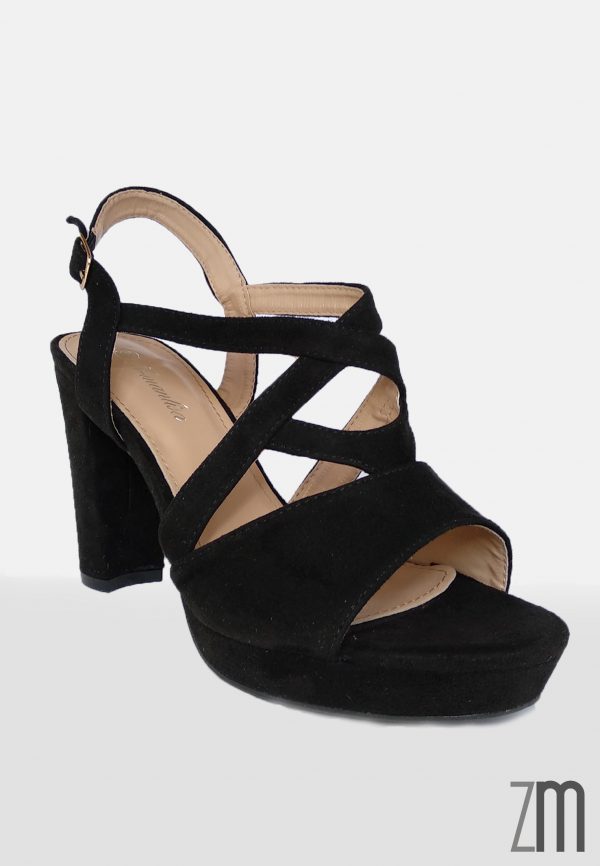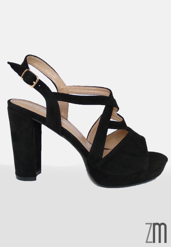 Sandalia fabricad en antelina con un tacón de 11 cm de altura con una plataforma de 2 cm y sujeción de hebilla. Calzado de importación.