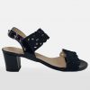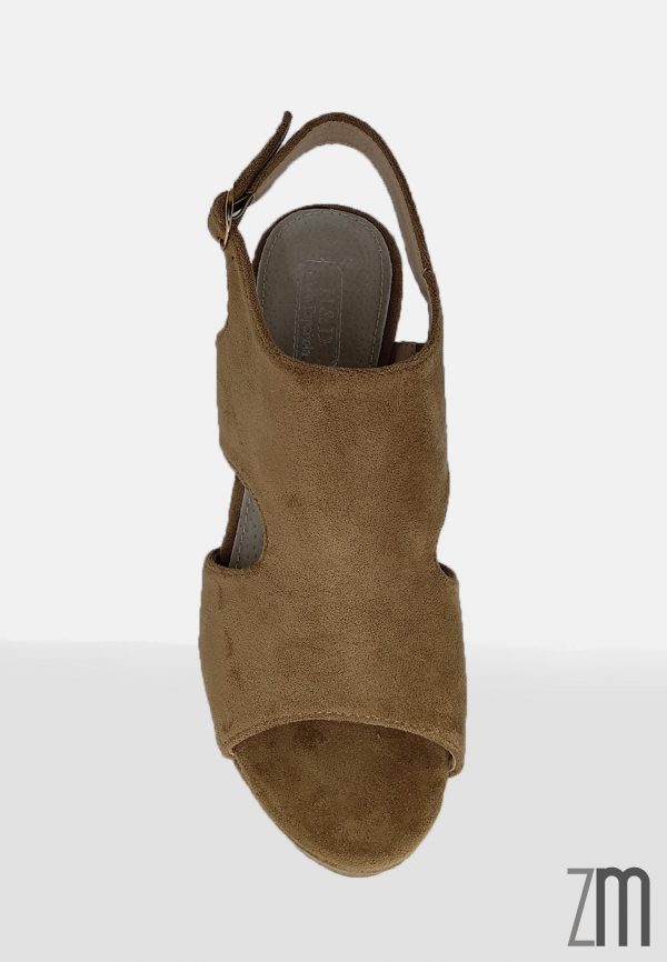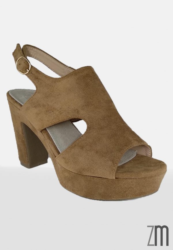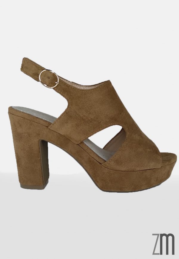 Sandalia fabrica en antelina y plantilla de piel con un tacón de 10 cm de altura con una plataforma de 2,5 cm y sujeción de hebilla. Calzado de importación.