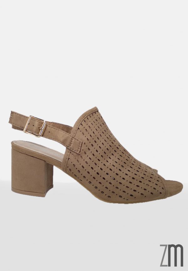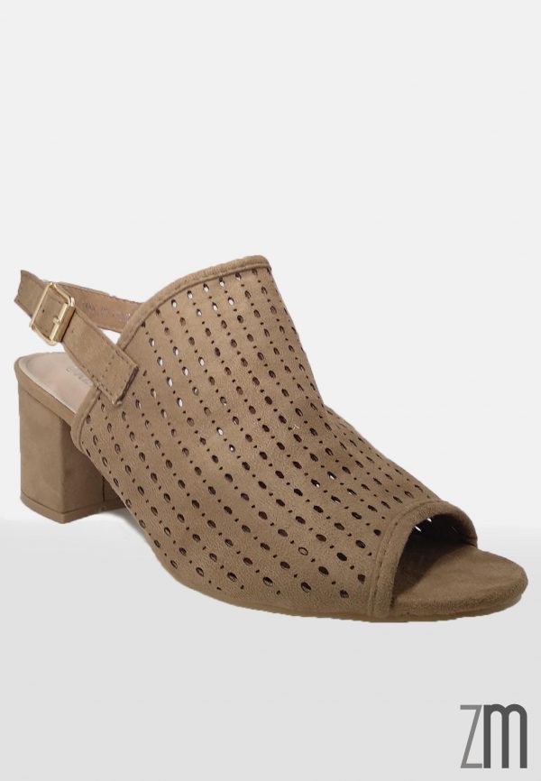 Sandalia fabricada en antelina picada de color khaki, con un tacón de 6,7 cm de altura. Con puntera abierta y sujeción trasera de correa con hebilla. Calzado de importación.