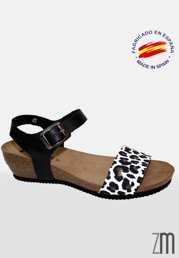 Sandalia Mart bioconfort en color leopardo negro con blanco, plantilla de gel. Cómoda y ligera. Calzado nacional.