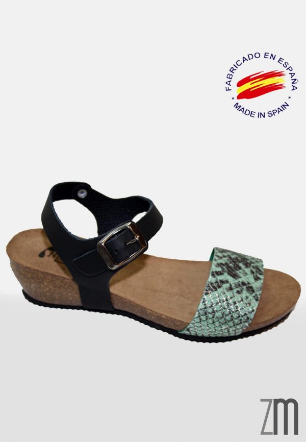 Sandalia Mart bioconfort en color serpiente verde, plantilla de gel. Cómoda y ligera. Calzado nacional.