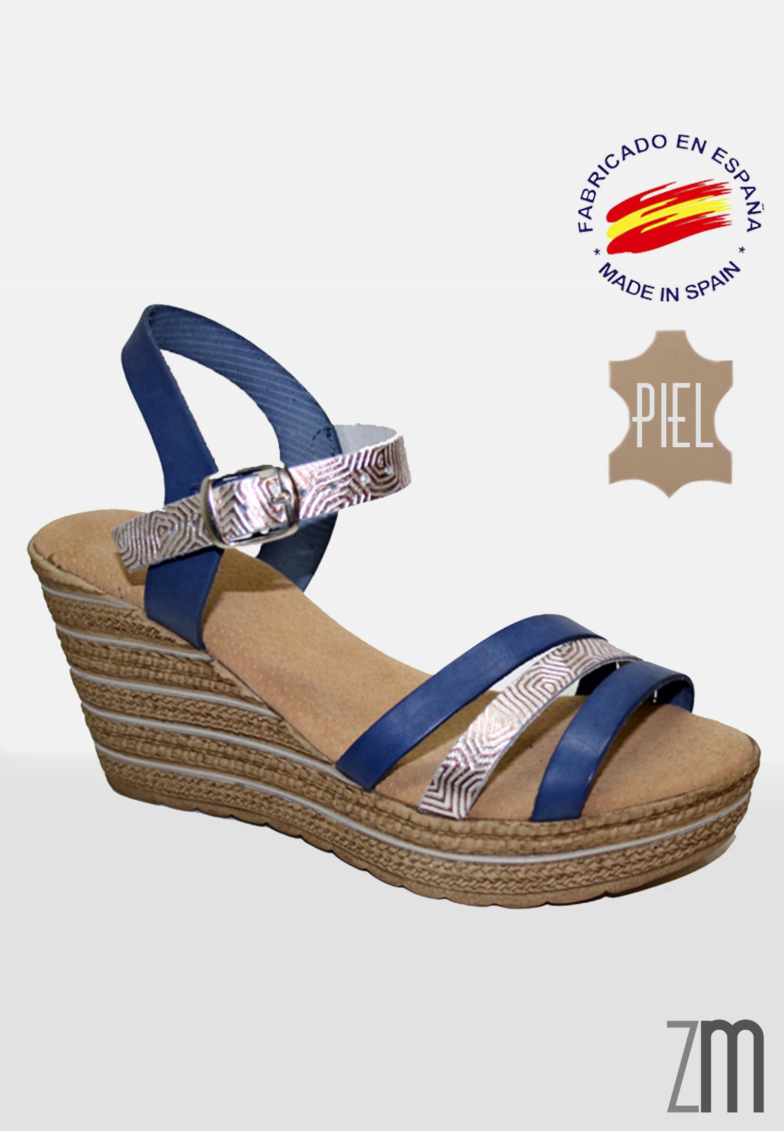 Sandalia con cuña en piel y planta de gel. Calzado nacional.