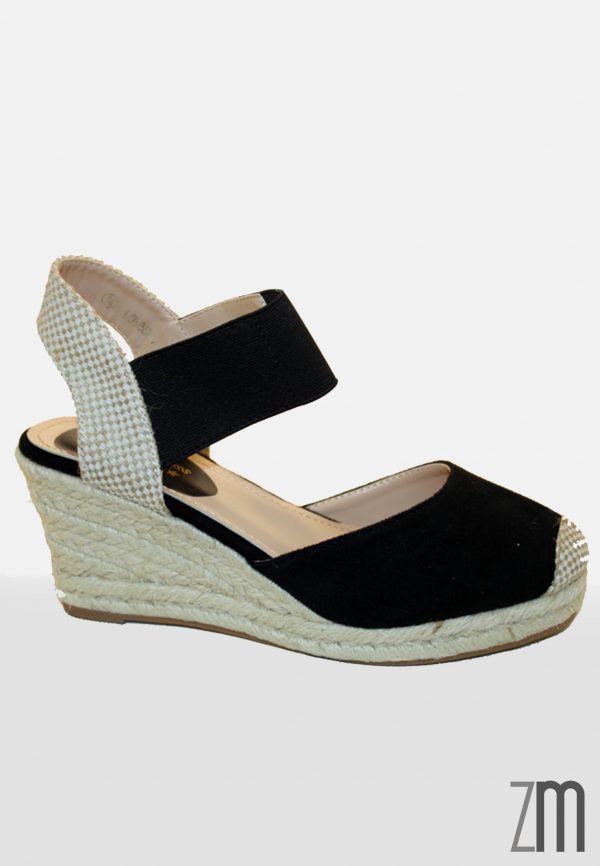 Valenciana en ante de color negro elástico central al tono, cuña y cuerda natural. Calzado de importación.