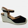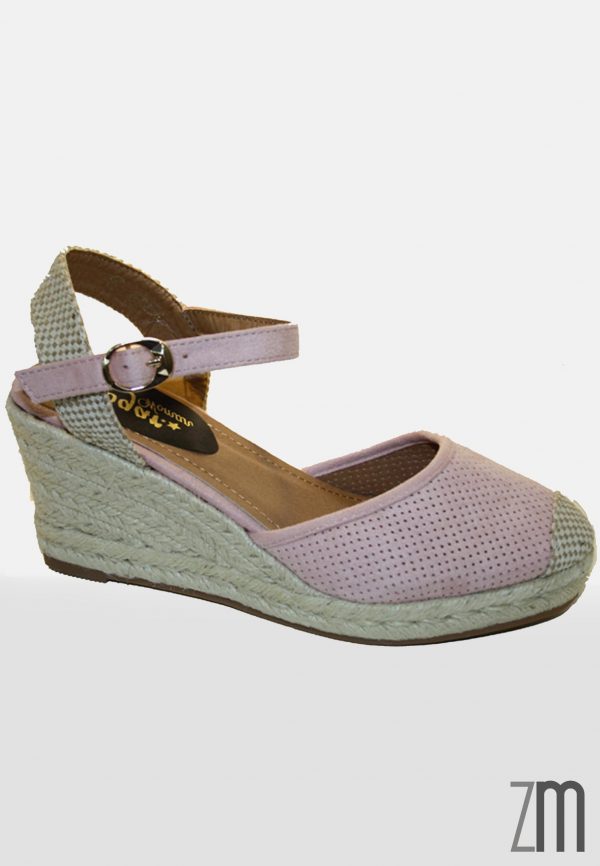 Valenciana en ante perforado de color rosa palo, cuña de cuerda natural. Calzado de importación.