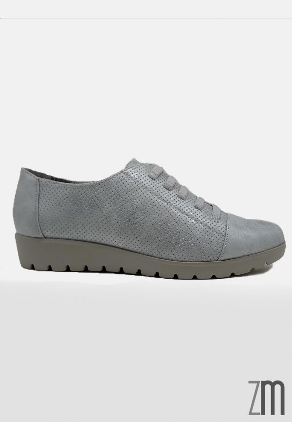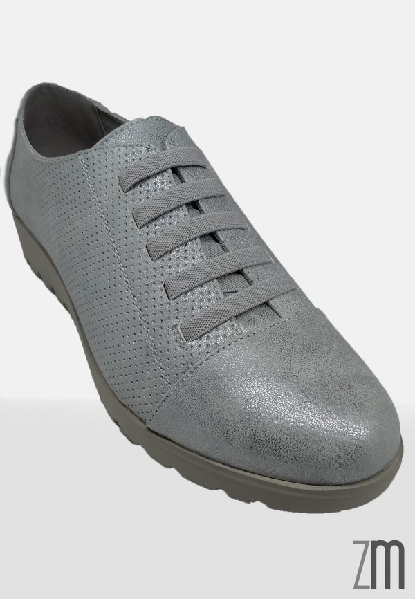 Zapato con cordoneras elásticas decorativas y leve picado de color plata con brillo y puntera redonda. Calzado de importación.